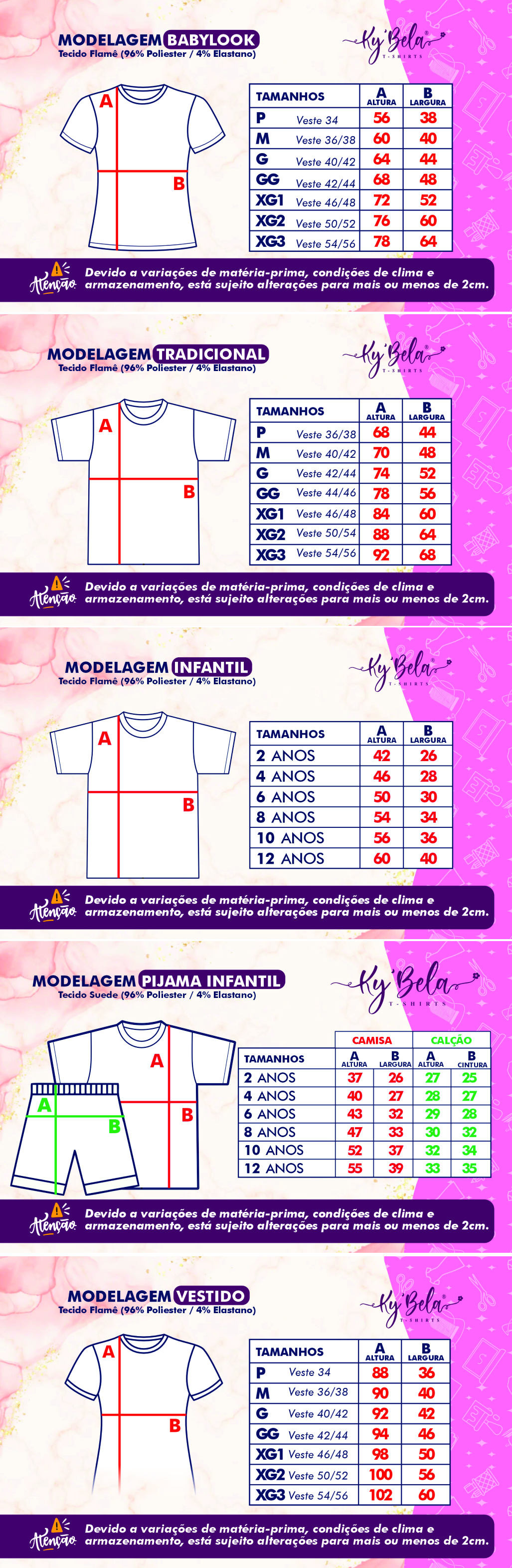 Babylook Feminina G Babylook Feminina GG Babylook Feminina P Babylook Feminina M Babylook Feminina XG1 Babylook Feminina XG2 Babylook Feminina XG3 Camiseta Masculina P Camiseta Masculina M Camiseta Masculina G Camiseta Masculina GG Camiseta Masculina XG1 Camiseta Masculina XG2 Camiseta Masculina XG3 Infantil 02 anos Infantil 04 anos Infantil 06 anos Infantil 08 anos Infantil 10 anos Infantil 12 anos Vestido G Vestido GG Vestido M Vestido P Vestido XG1 Vestido XG2 Vestido XG3