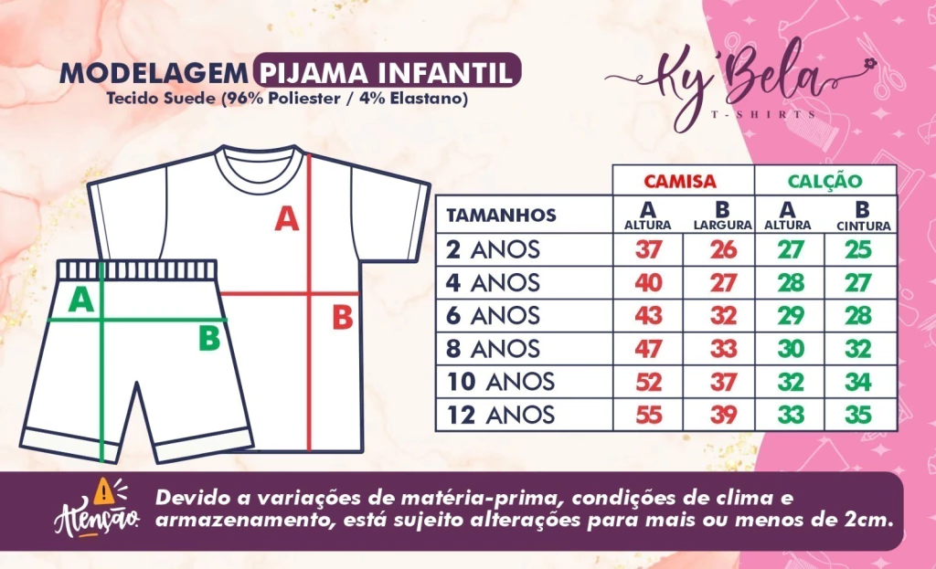 Tabela de Medidas do PIJAMA INFANTIL, variação de costura de 2cm pra mais ou pra menos.